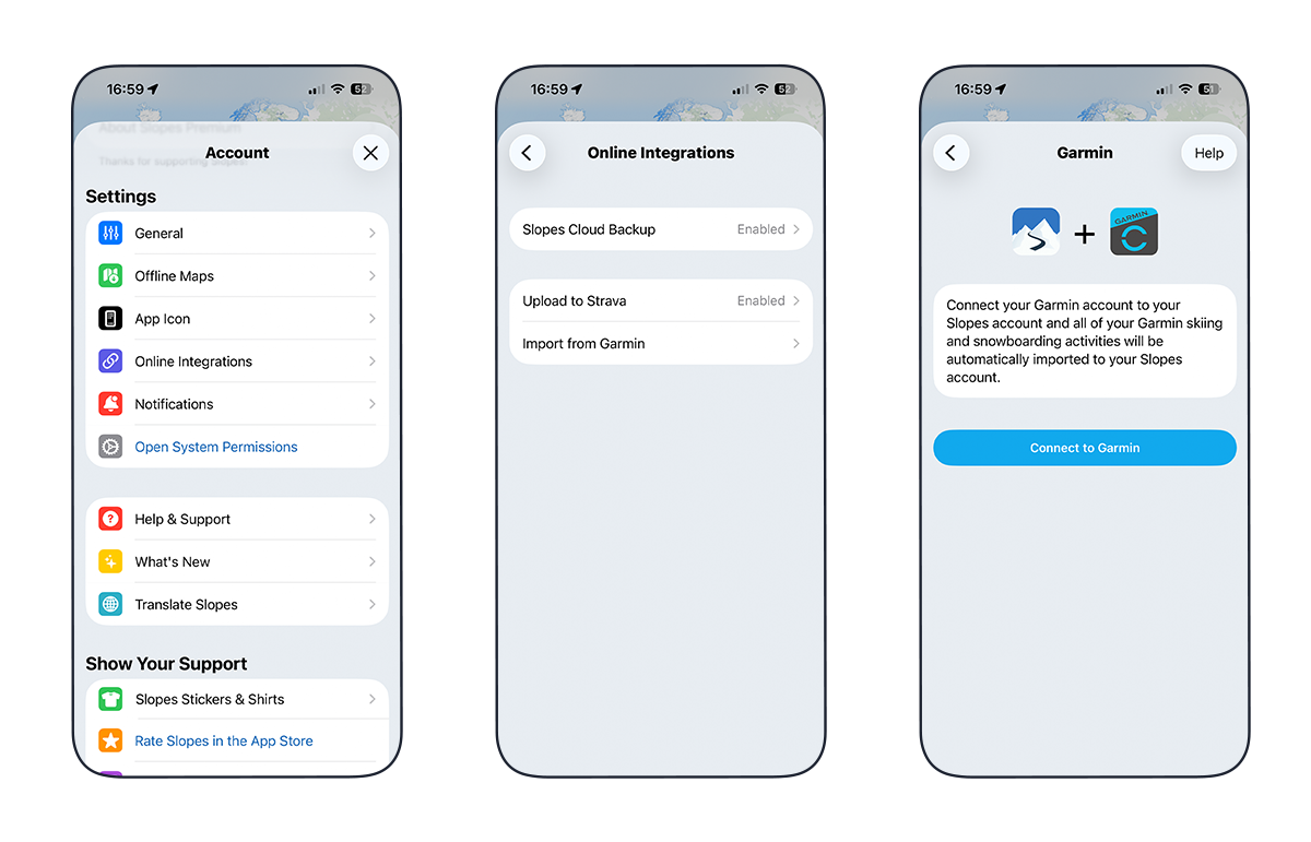 - Slopes has a direct integration with Garmin Connect, which automatically imports up to five years’ worth of your ski data.