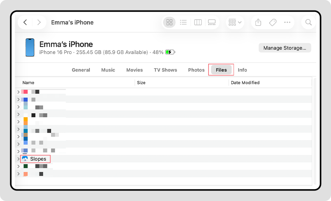 On macOS Catalina or later, you can connect your iPhone to your Mac and use the Finder to import files in bulk. Simply drag and drop the files you want to import into the Slopes folder, and that's it. We'll do the rest.
