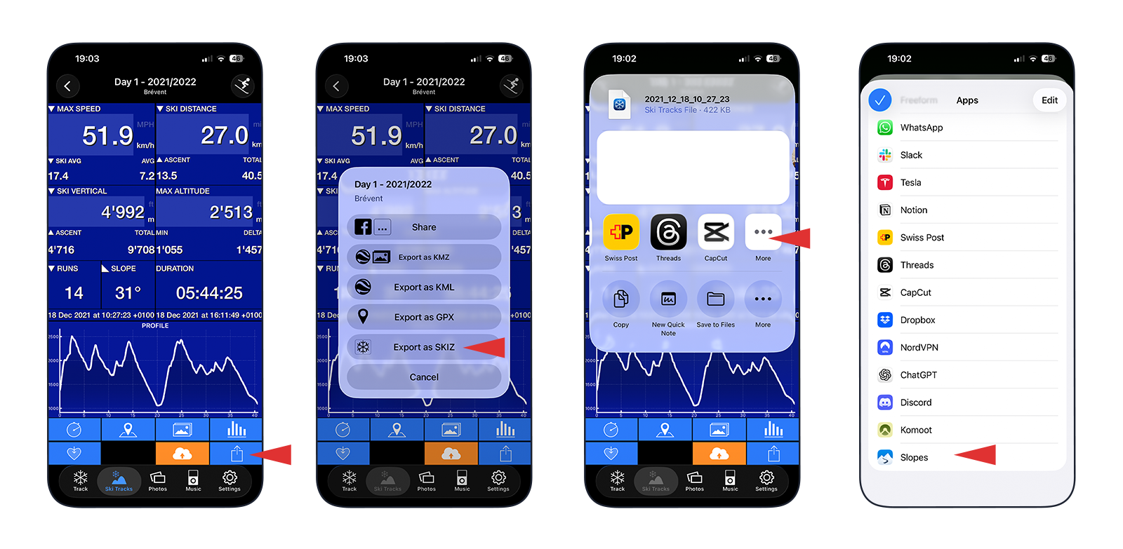 ‼️ Ski Track direct transfer: if you're on iPhone, you can directly export - import activtites from Ski Tracks to Slopes. Simply select the <Export as SKIZ> in the Ski Tracks app, then select Slopes as destination (might be under More tab - see visual instructions below).