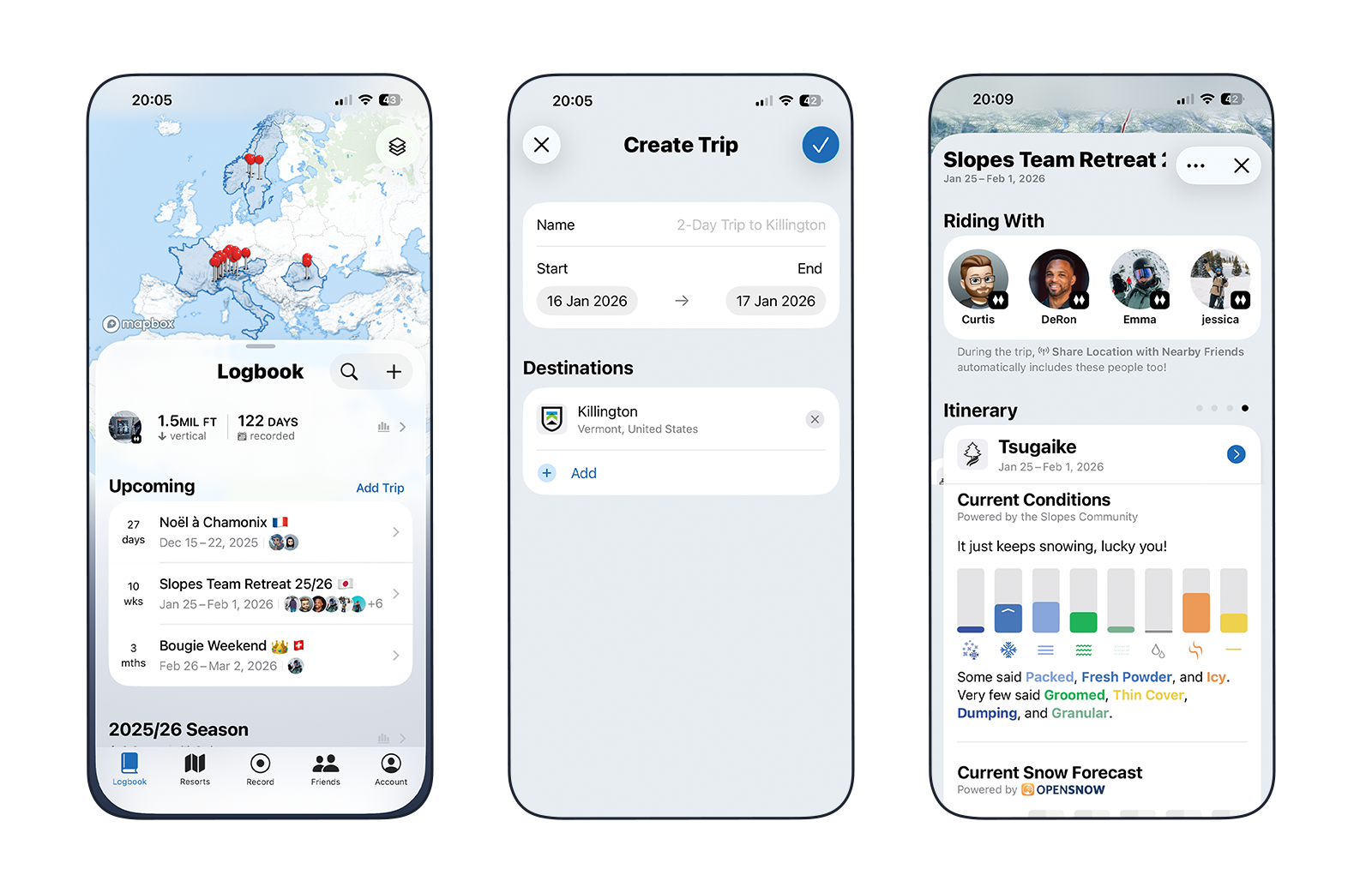 Creating a trip is easy. At the top of the Logbook, right under your Lifetime Stats, there’s now an Upcoming Trips section (>Add Trip). Name your trip, set dates and locations (you can include multiple resorts), save it, and you’re good to go.